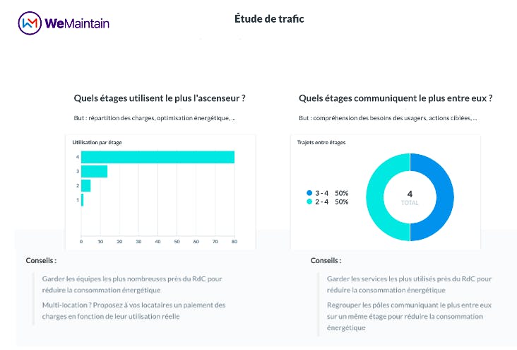 En réunissant data et expertise humaine sur le terrain, notre modèle nous permet d'optimiser la disponibilité des ascenseurs, de réduire le temps d'immobilisation et d'apporter à nos clients une meilleure compréhension de leurs appareils afin d'optimiser leur expérience au quotidien. Les informations sont transformées en indicateurs utiles au client. Après analyse des flux liés à la cabine (analyse du trafic, étages les plus fréquemment utilisés, comptage de personnes en cabine, etc.), le propriétaire et le gestionnaire appréhendent mieux les parcours des occupants. A la demande du client, WeMaintain peut ensuite optimiser ces derniers, notamment en réduisant les temps d'attente liés à certains appareils.
