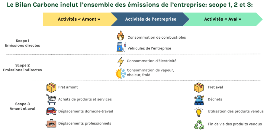 Les personnes, les produits ou les organisations ont tous une empreinte carbone. La quantité de gaz à effet de serre émise peut provenir de diverses sources, notamment des aliments que vous consommez ou des tee-shirts que vous portez. Il est possible de mesurer la quantité de carbone émise par les activités directes et indirectes de l'entreprise. A chaque type d'émission est alors associé ce que l’on appelle une “scope” 1, 2 ou 3 :