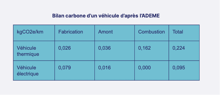 Nous étions préoccupés par le fait que les véhicules électriques soient plus émetteurs que les véhicules thermiques au moment de leur fabrication. Mais selon l'ADEME, l'agence française pour la transition écologique, un véhicule électrique émet moins de CO2 aujourd'hui qu’un véhicule thermique lorsque l’on prend en considération l’ensemble de son cycle de vie. Le tableau ci-dessous montre qu’en France, l'impact d'une voiture électrique est en fait 2,35 fois plus faible que celui d'une voiture thermique.