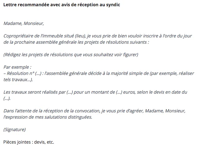 D'après le décret du 17 mars 1967 (article 10), chaque copropriétaire pourra transmettre au préalable ses questions au Président du conseil syndical ou bien directement au syndic de copropriété, au plus tard vingt et un jours avant la tenue de l'assemblée générale avant la tenue de l'assemblée générale, par le biais d'un courrier en recommandé avec accusé de réception.