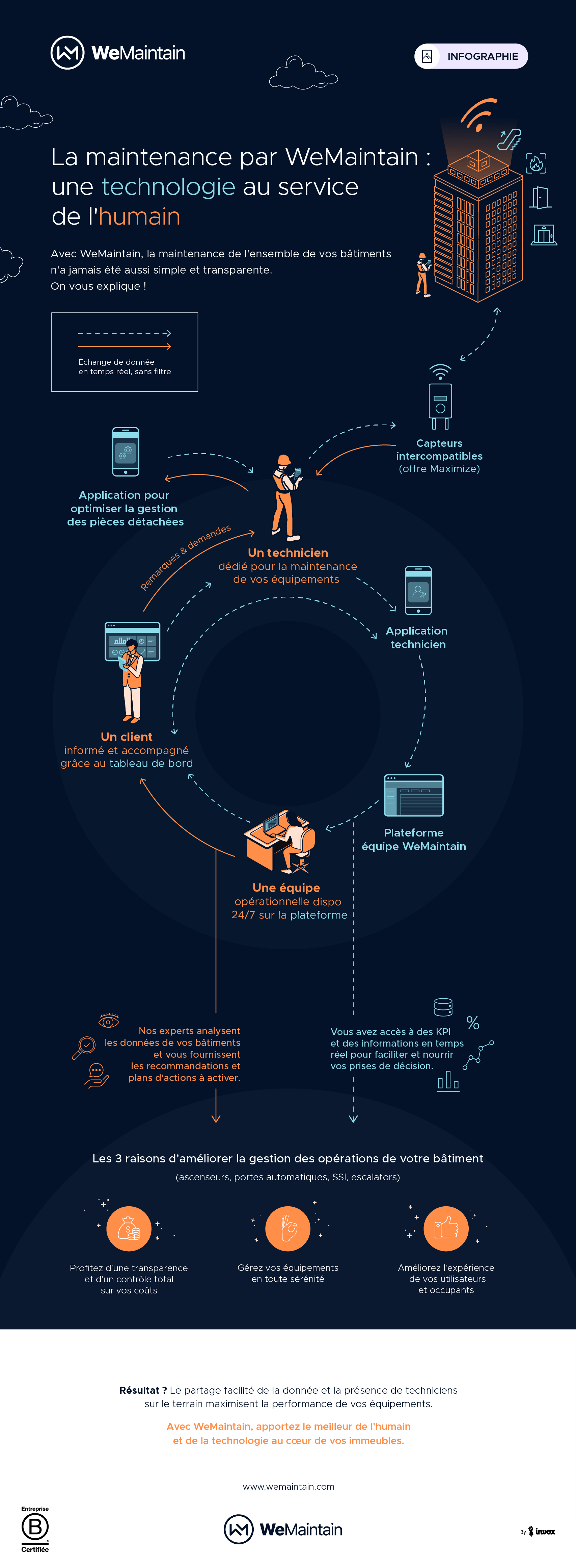 Entre le déploiement de logiciels, l’installation de boîtier connecté et les acteurs présents sur le terrain, le fonctionnement de WeMaintain peut sembler complexe. Et pourtant, la maintenance de l’ensemble de vos bâtiments peut être simple et bénéfique ! Découvrez en images notre fonctionnement, qui place l’humain au cœur de dispositifs de pointe.