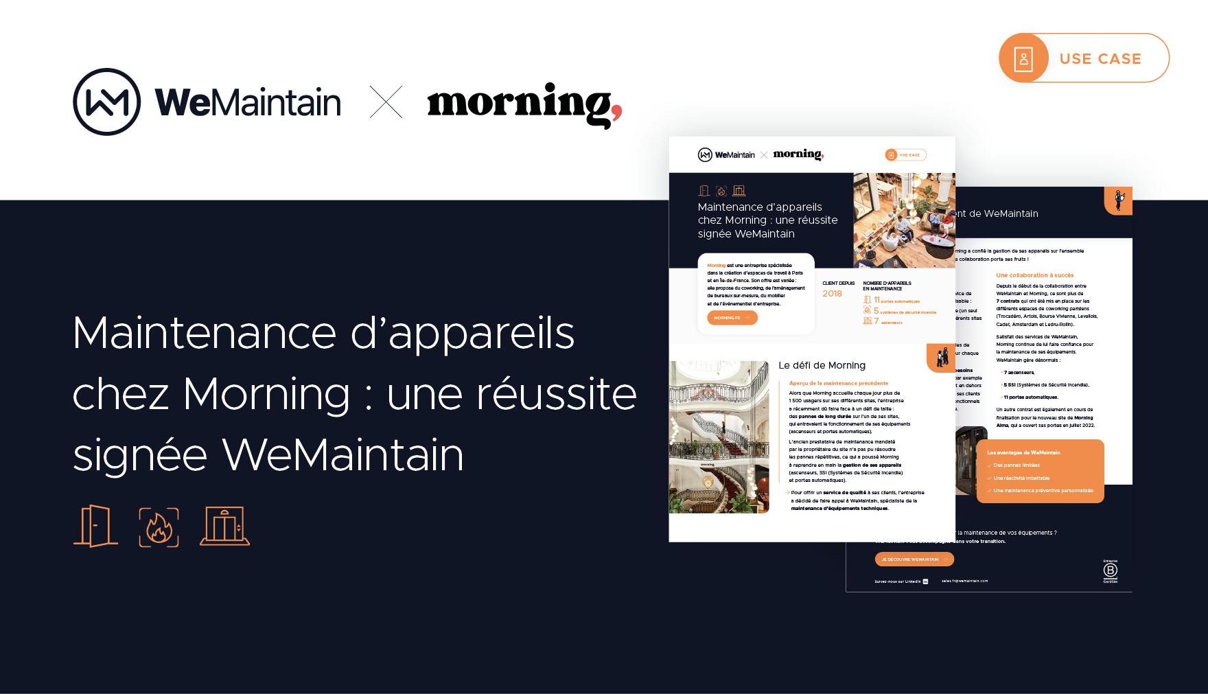 Dans les espaces de travail, des équipements tels que les ascenseurs, portes automatiques et SSI sont essentiels à la sécurité, à l’accessibilité et au confort des collaborateurs. Une maintenance fiable et efficace est donc indispensable pour toute entreprise dédiée à la création de tels lieux de travail. C’est le cas de Morning, une entreprise française qui fait confiance à WeMaintain depuis 4 ans déjà !